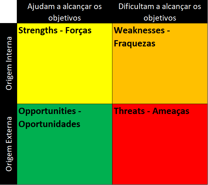 O nome SWOT provém de quatro palavras que começam com as letras da sigla: Strengths (forças), Weaknesses (fraquezas), Opportunities (oportunidades) e Threats (ameaças).