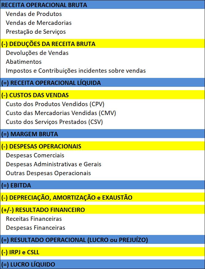 Em resumo, o Demonstrativo de Resultados (DRE) de uma empresa pode ser estruturado da seguinte maneira: