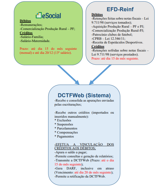 Por ser gerada a partir das informações alimentadas pelo eSocial e EFD-Reinf, a DCTFWeb declara tanto os débitos e créditos da EFD-Reinf quanto os dispostos no eSocial, bem como outros tributos: