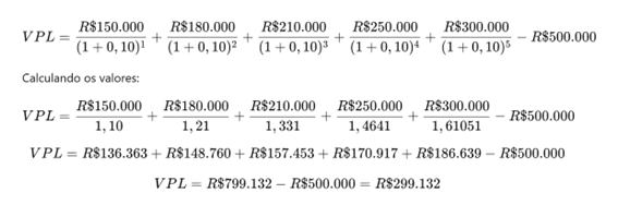 A taxa de desconto utilizada é de 10%, refletindo o custo de capital da empresa. Para calcular o VPL, basta descontar os fluxos de caixa futuros para o valor presente, somando-os e subtraindo o investimento inicial, que foi de R$ 500.000.